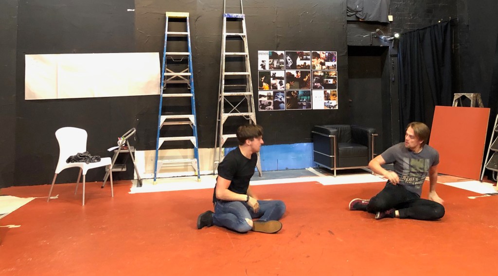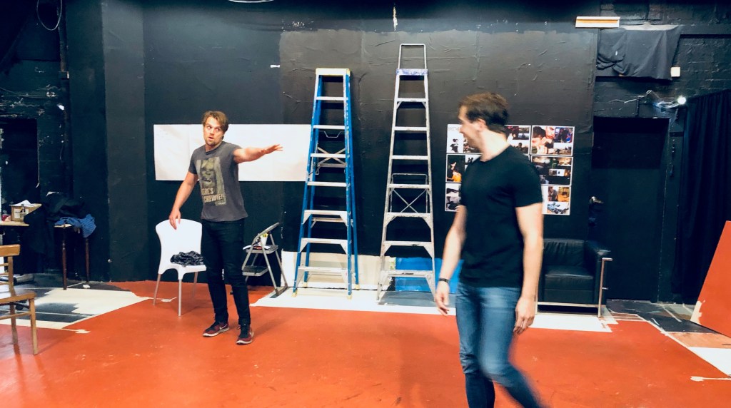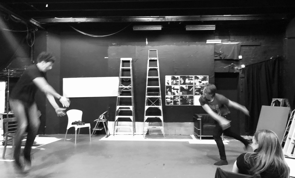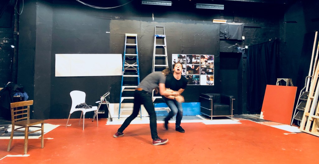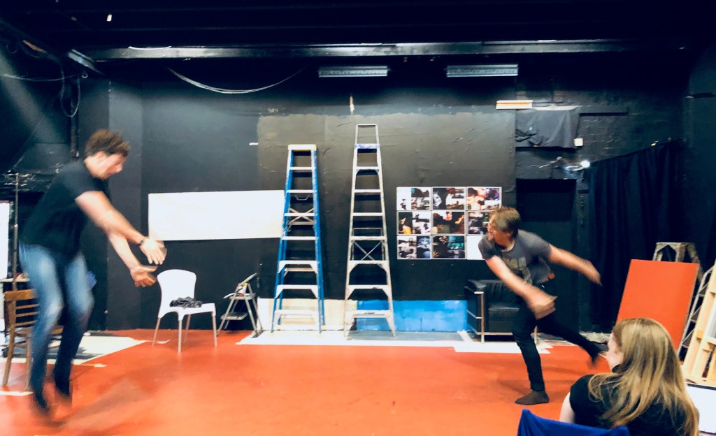 We’re about to play a game, a warmup game, instigated by Peter. The game is named ‘Yes, Let ‘s’, and involved us flying a plane, digging a garden, parachuting and much more while shouting, ‘Yes, let’s!‘. Pete then had us become a working machine. I loved this exercise. It forced us to connect as Peter asked us to showcase a movement that best-represented fear, grief and forgiveness, the underpinning themes in my new play, ‘BROTHERS’.