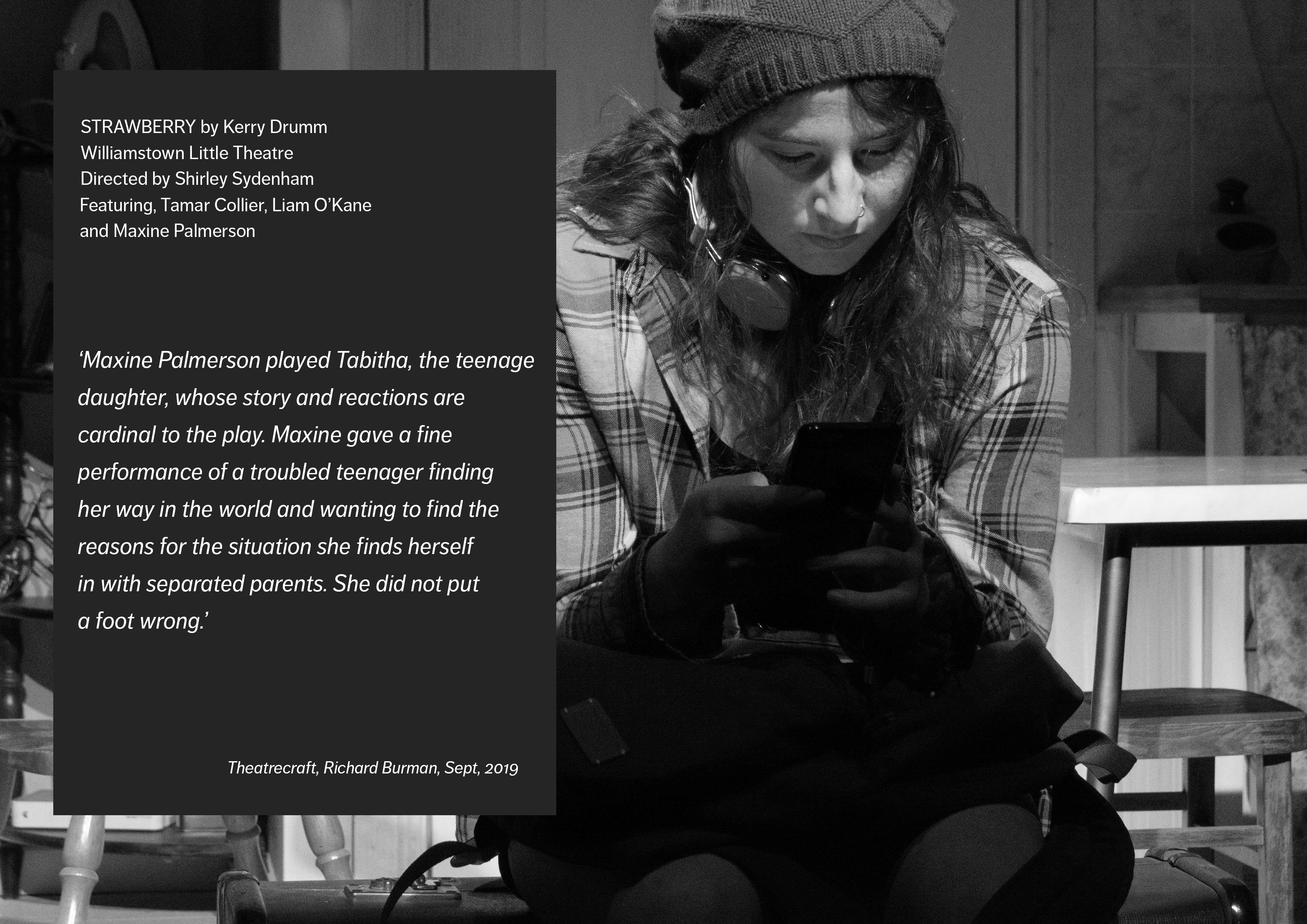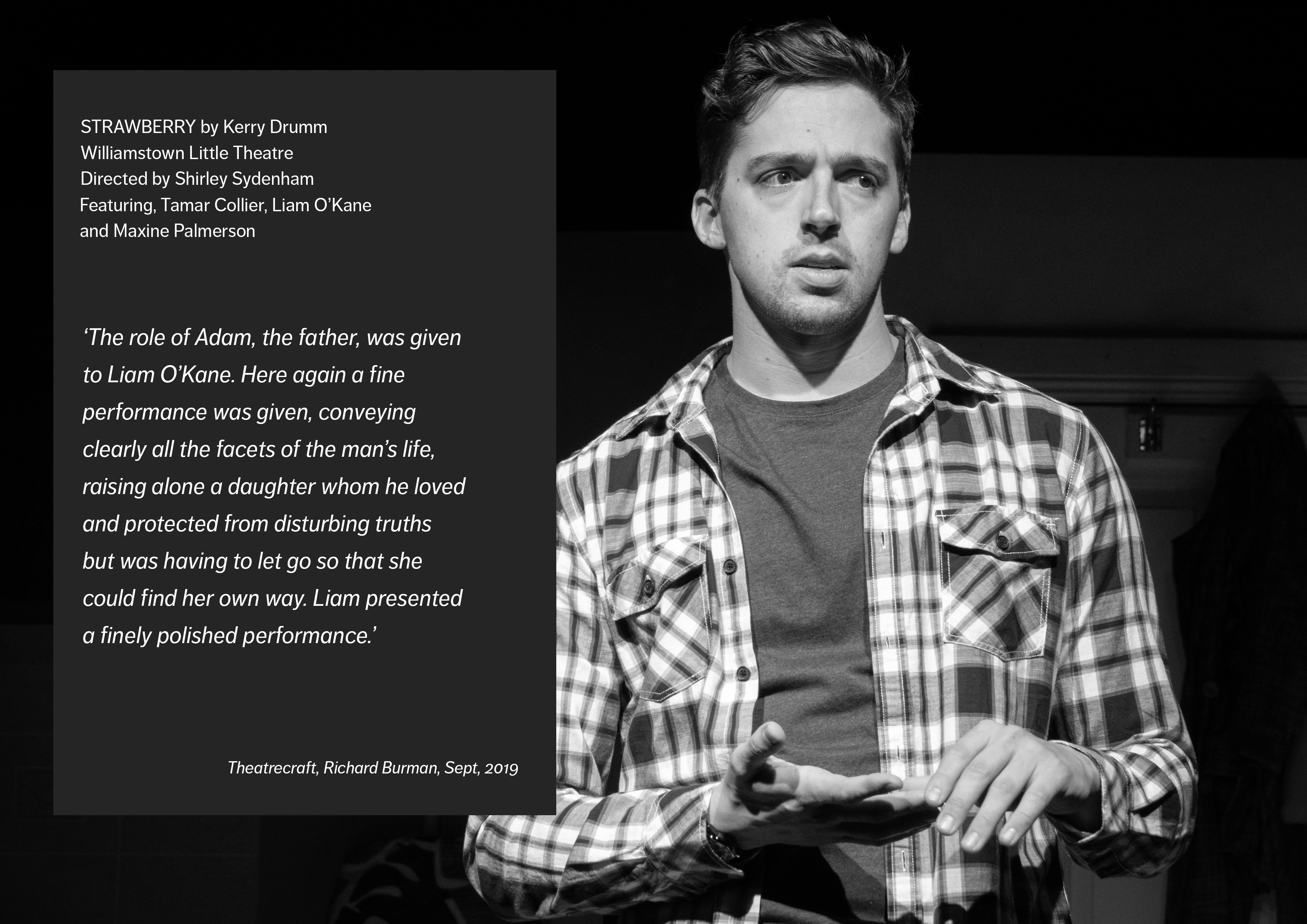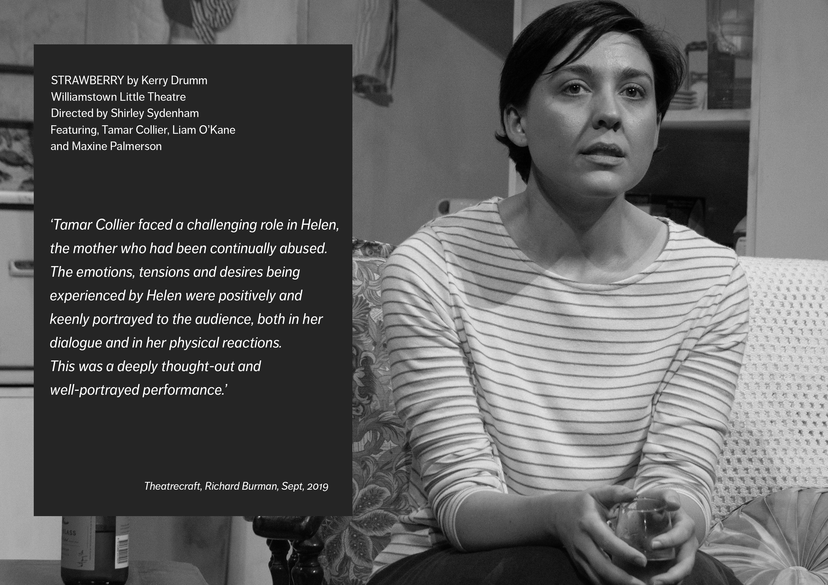 Strawberry had its world premiere at Williamstown Little Theatre (WLT). 16 performances from 4th September to 21st September. Directed by Shirley Sydenham, featuring Tamar Collier, Liam O’Kane and Maxine Palmerson,